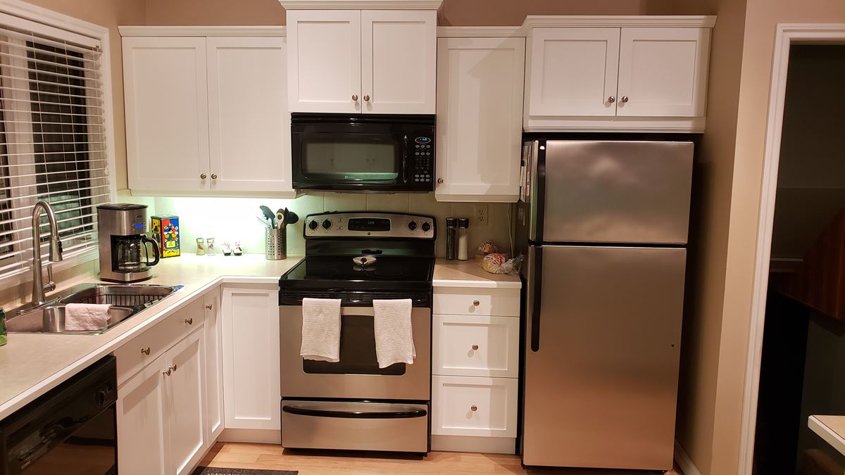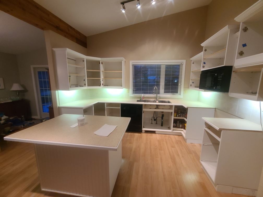 The owners did much research on colour and were tempted to go 2 tone on the new colour scheme. The home improvement shows and magazines often have an accented island and that was really appealing but It can be hard to choose that perfect accent that you can live with for a long time. Our clients opted for a single colour. Their new colour choice is Benjamin Moore Chantilly Lace, OC-65. This is a common white for Kitchen Cabinet Spraying and it looks fantastic. It's clean and crisp.