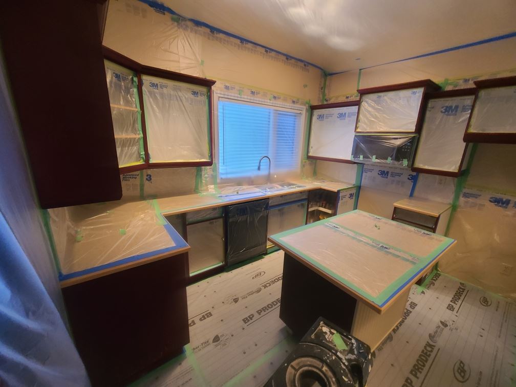 The whole process took 2 days to spray onsite including set-up and clean-up, a half day at the beginning to remove the doors and drawer fronts, & another half day at the end for door and drawer re-installation. Total time of 10 working days.