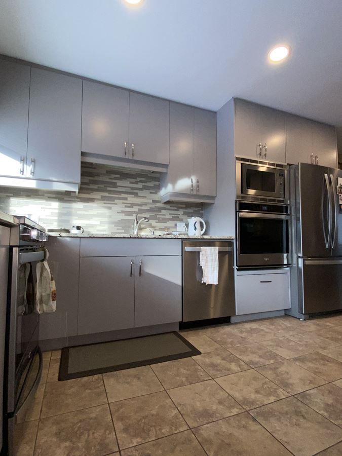 This project was exciting for us as it was a fairly new kitchen with a maple Veneer. The maple veneer slab doors were beautifully smooth which provided a wonderful canvas for the new coating to be spray applied to.