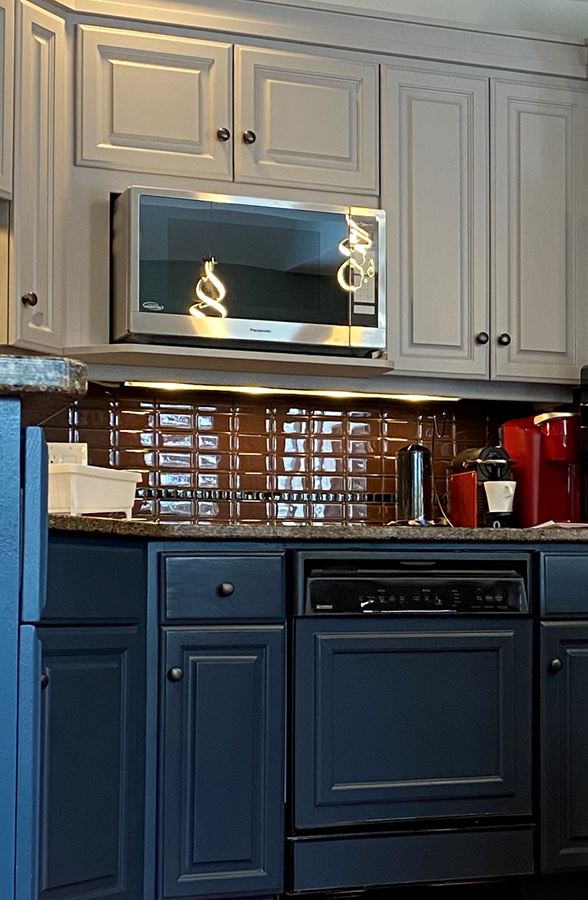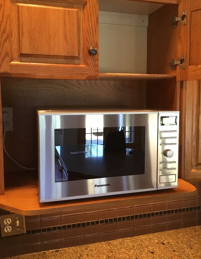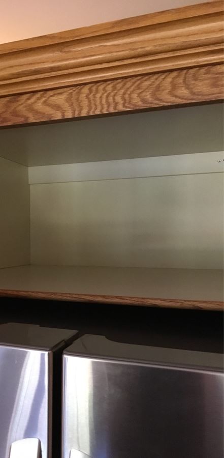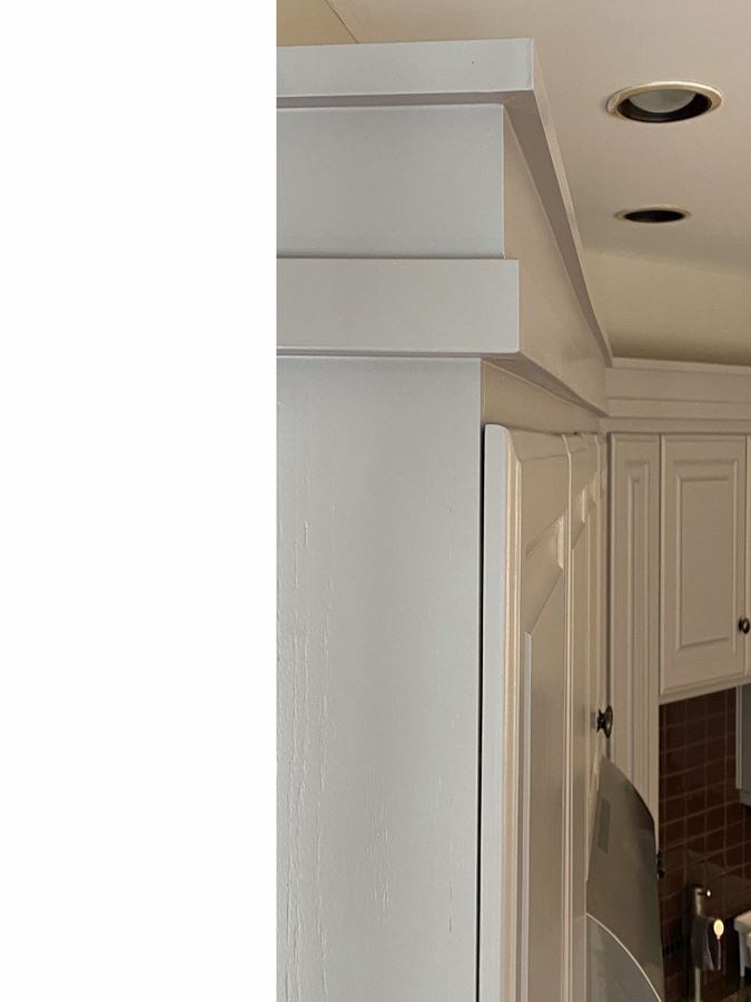 We were entrusted to update the crown moulding at the top of the cabinets with something a little bit more modern, tighten the opening surrounding the microwave oven, as well as raise the small cabinet above the refrigerator to make room for a modern sized appliance.