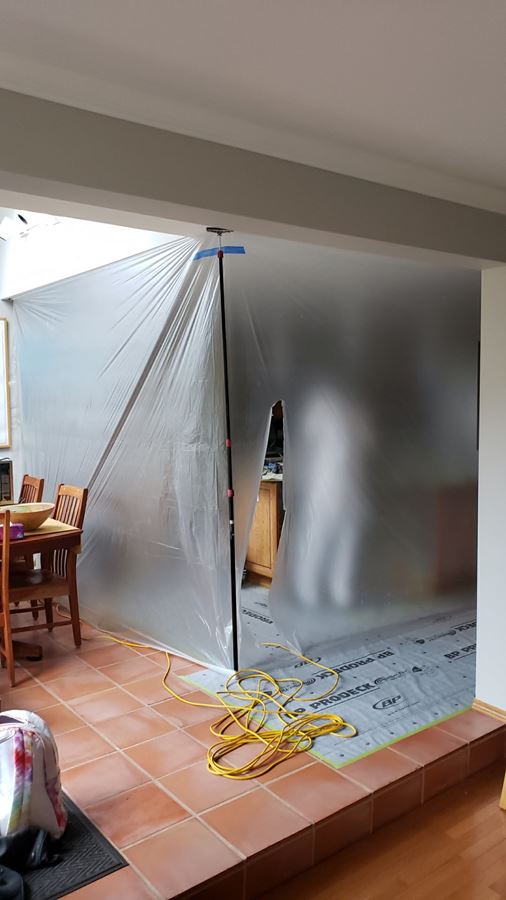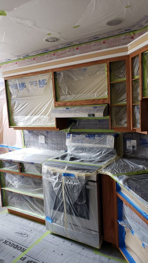 Onsite, we prepared the kitchen as best we could to allow for as little evidence of our invasive task inside the home. Separating the kitchen from the rest of the house and protecting areas not requiring a new finish, was job #1.